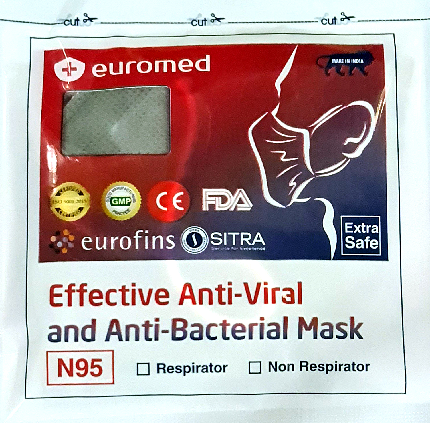 N95 Class face mask from Euromed in Grey colour. Pack of 15 Nos x 4= 60 Masks Price 2,400/-+5%+ Rs.150 Packing