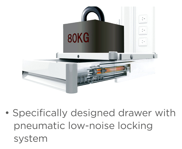 · Shelves / drawer with 80Kg load capacity available for EU and US rails version