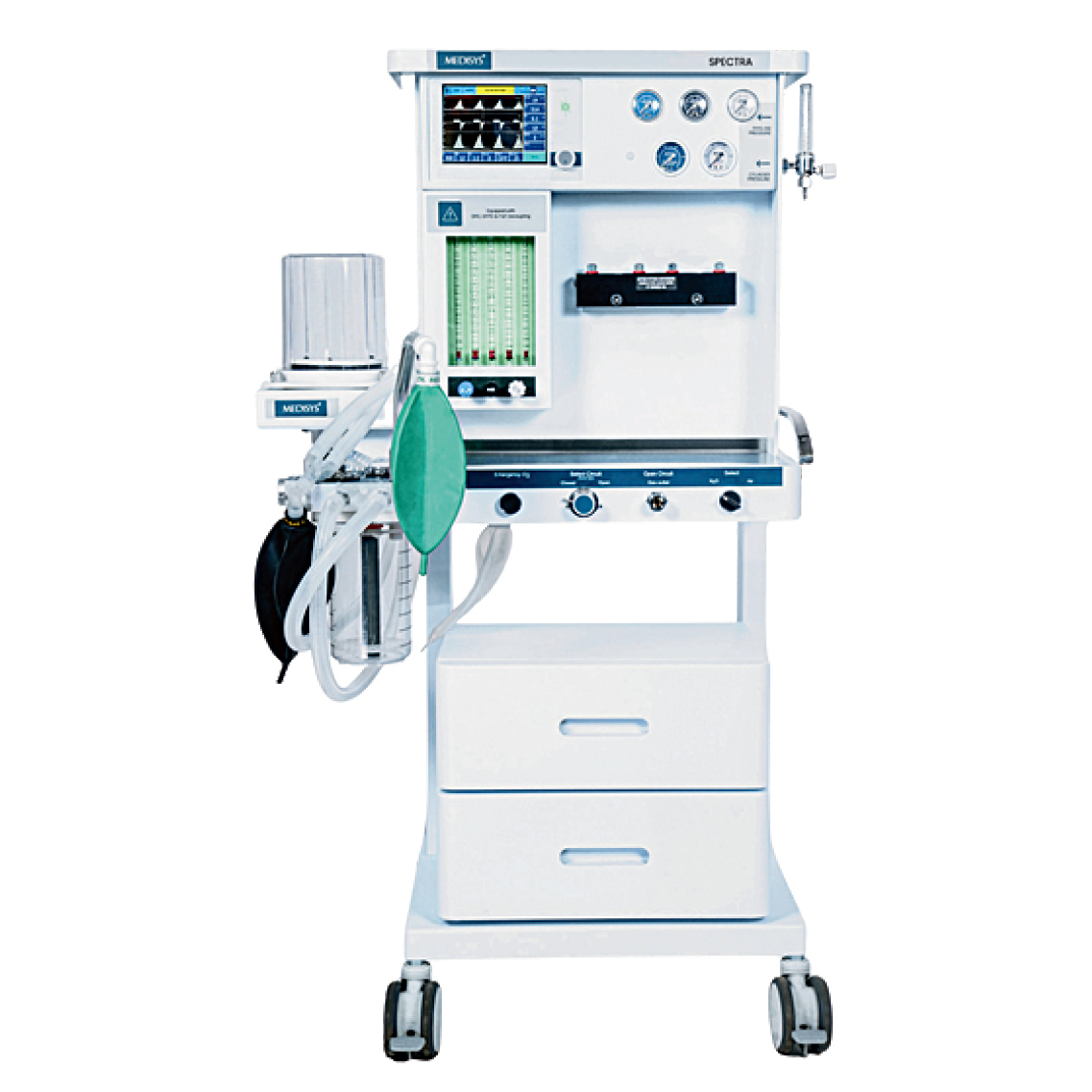 Switchable ACGO: ISO 22 mm OD and 15 mm ID CO2 absorbent: Quick release type with volume 1.5L. Highly integrated design reduces leaks and misconnects Bag/Vent switch: switch for manual and mechanical ventilation. Integrated Adjustable Pressure Limiting (APL) valve: ≤ 6KPa